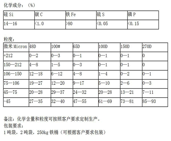 实际生产中应用较多的是贵州重介质硅铁,这是一种专门冶炼成的硅贵州铁合金,具有耐氧化,硬度大,带强磁性等特点。使用后经过筛分和磁选回收,可以返回再用。硅铁中含硅小于13%时,韧性增加,给磨碎制备带来困难,而且在水中易于氧化,当含硅超过18%时,磁性减弱不便回收。故以含硅14%-16%,含铁>80%的硅铁适合使用,冶炼成块状的硅铁需经磨碎后使用。