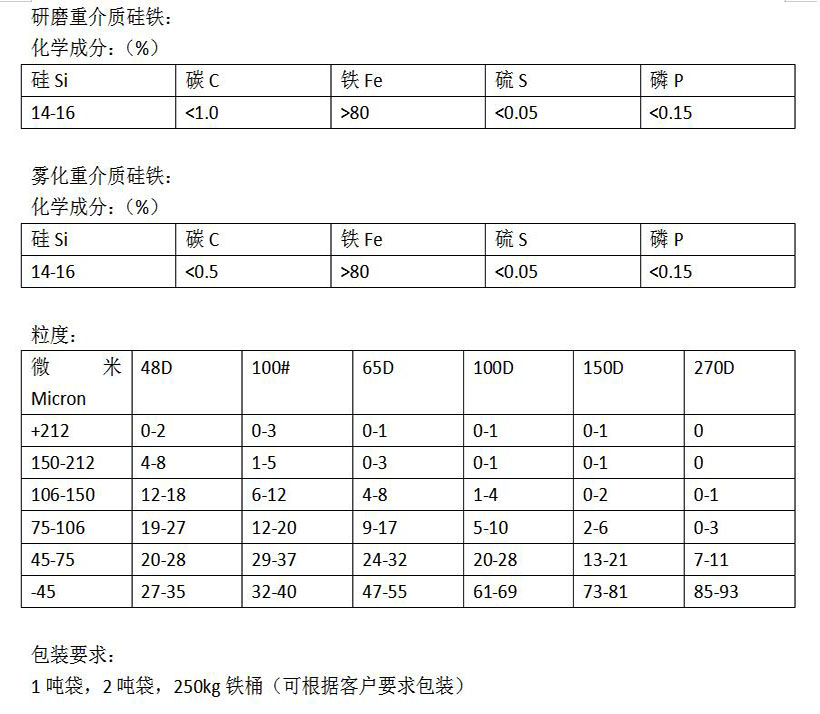 贵州重介质硅铁是一种应用广泛,专门冶炼而成的硅贵州铁合金,具有耐氧化,硬度大,带强磁性等特点,使用后经过筛分和磁选回收,可以返加再利用,因此,使用贵州重介质硅铁的话,有利用降低生产成本。硅铁中含硅量小于13%时,韧性增加,给磨碎制备带来困难,而且在水中易于氧化;当含硅量超过18%时,磁选性减弱不便回收。故以含硅13%-18%,含铁87%-82%的硅铁适合使用,冶炼成块的硅铁需要经过粉碎,研磨后才使用。